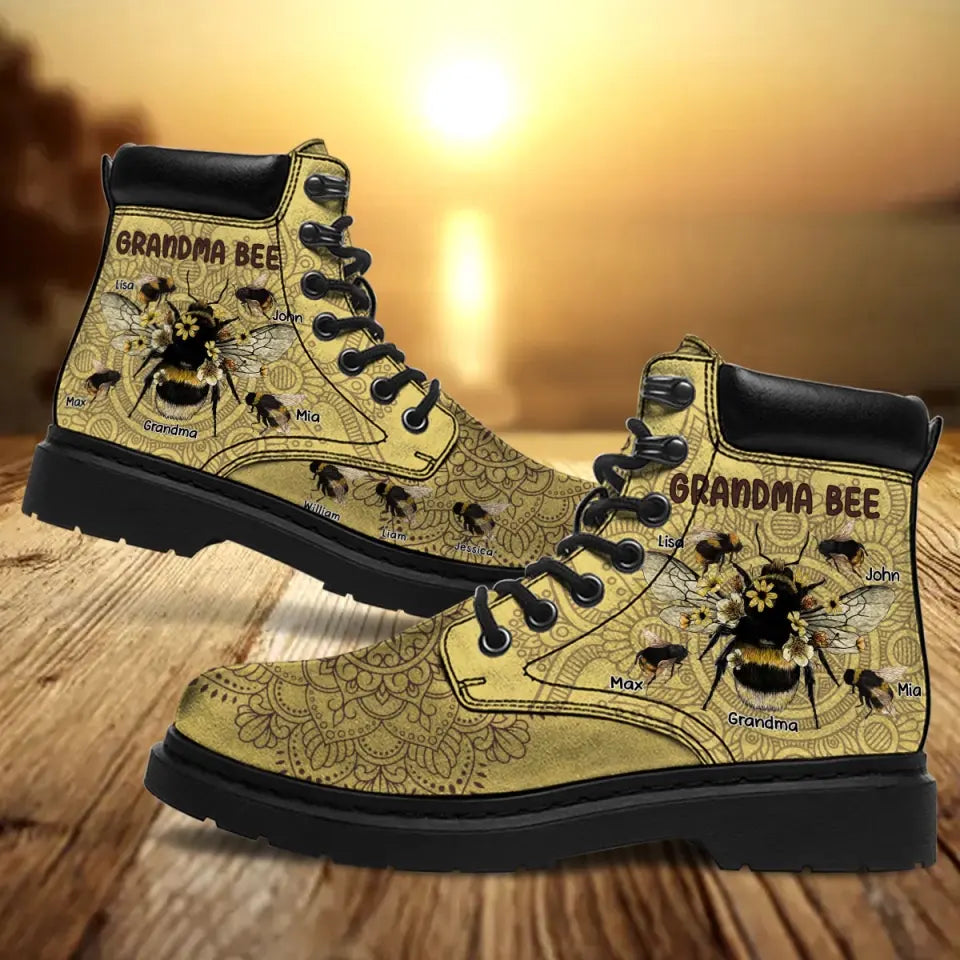 Personalized Grandma Bee & Kid Names Leather Boots Printed HTHVQ231082