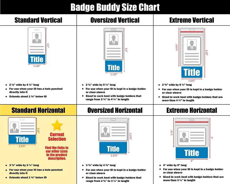 • Badge buddies hang 1” longer than your standard credit card sized vertical ID badge or credential.