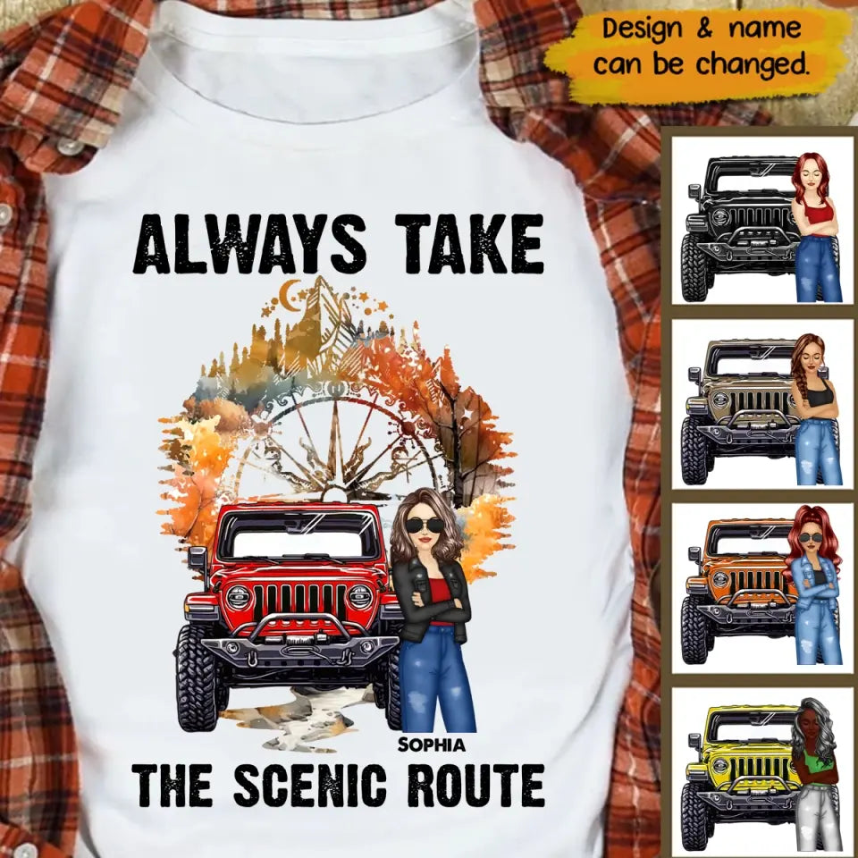 Personalized Always Take The Scenic Route Jeep Girl T-Shirt Printed MTPN1307